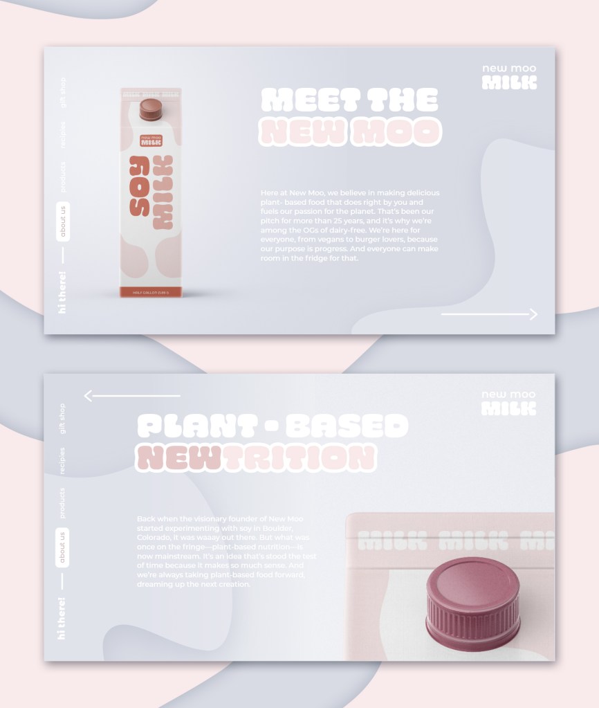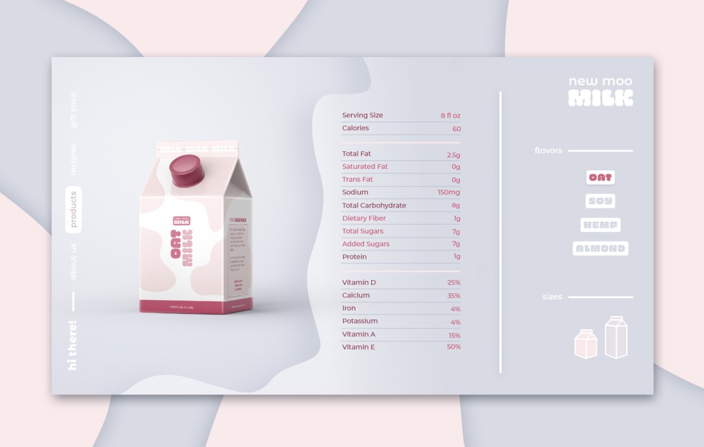 Packaging and UX UI Design for New Moo Milk: A fictional plant-based milk brand.