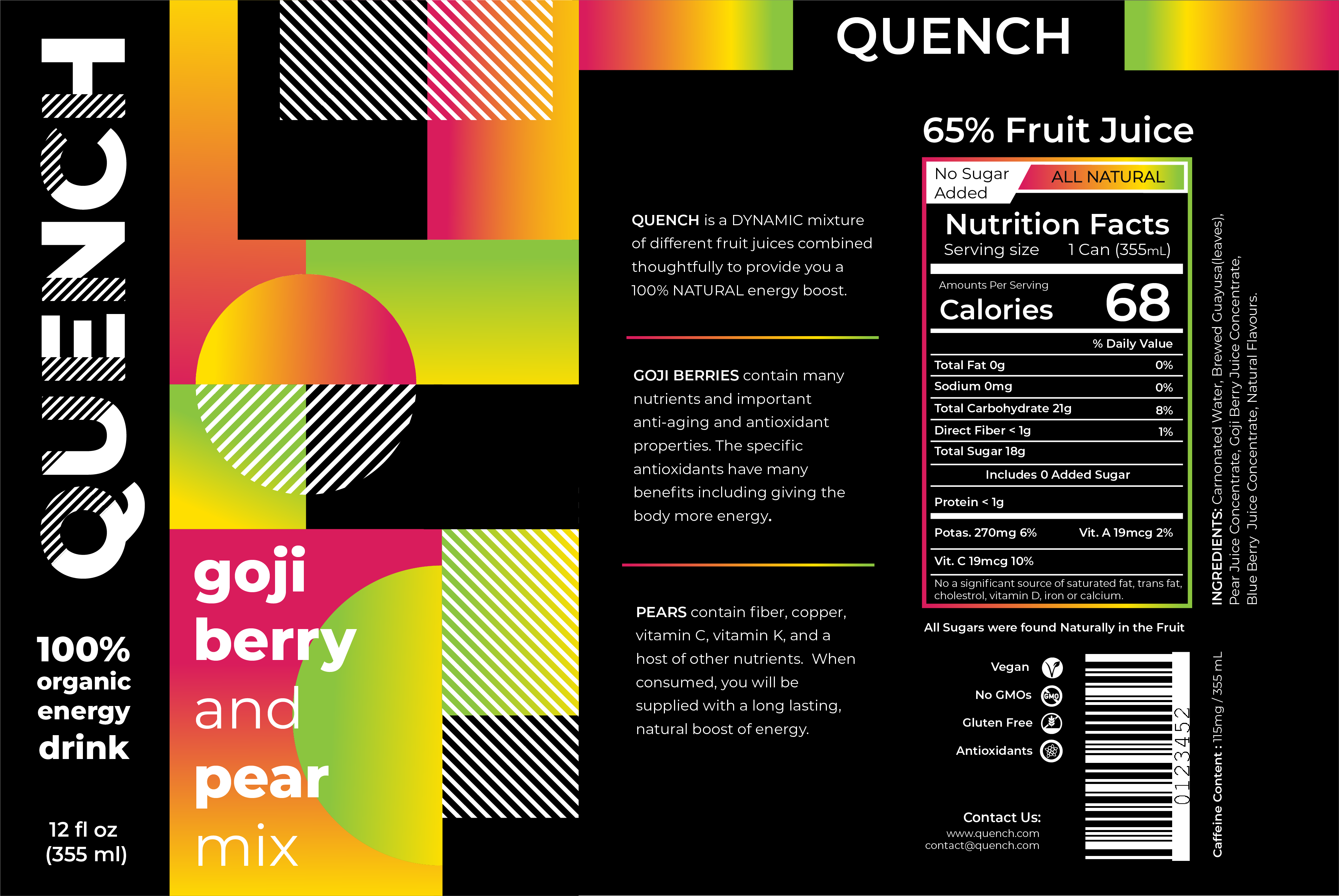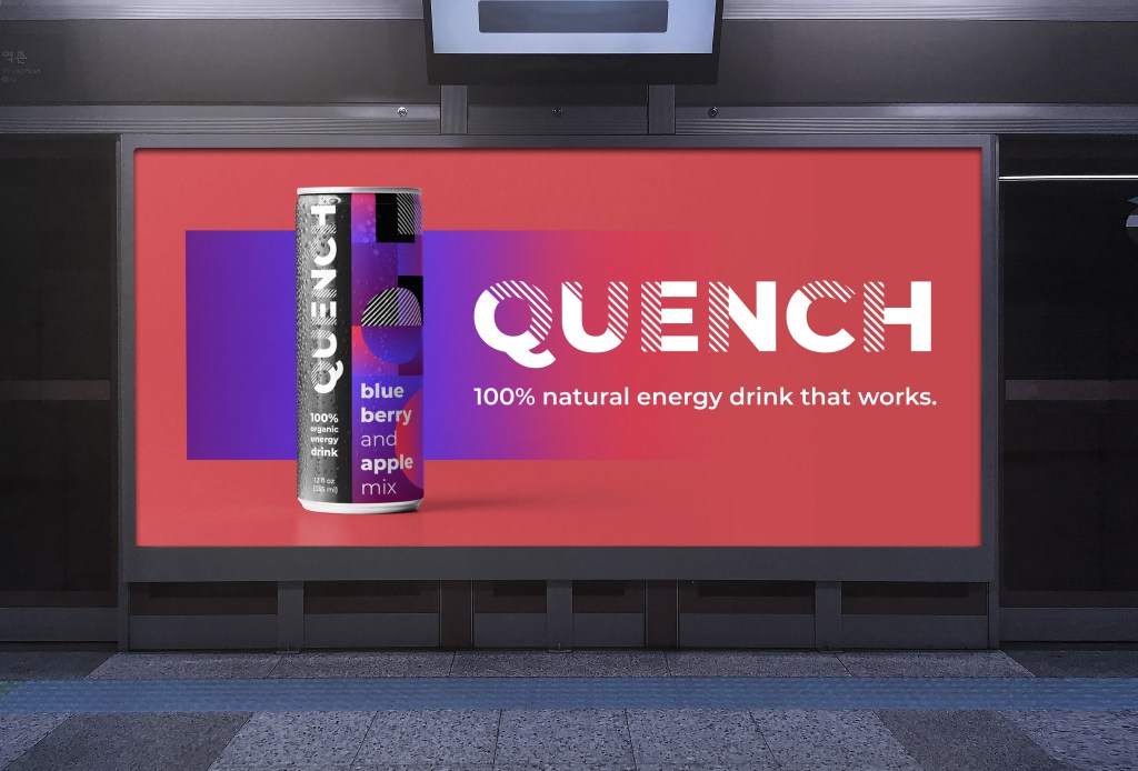 Solution: Quench is a concept energy drink brand that contains 100% natural and organic ingredients. Research was conducted to find which fruits have natural energy-boosting qualities in order to create a healthy alternative to the standard energy drink.